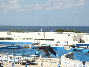 ◎もとぶ元気村での自然・文化体験コース① ドルフィンガイドツアー:イルカに直接触れたり、イルカショーの練習をどうやっているかなどの説明を聞きました。