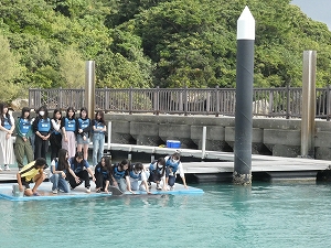 そして、体験学習別のバスに乗り込み、体験学習が先に行われる一部の体験班以外は美ら海水族館へ。水族館を見学した他、海洋博公園内を散策したり、イルカショーを見たりして午前中の約2時間半を過ごしました。