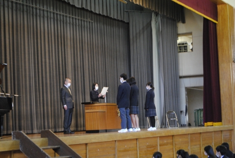 写真部、吹奏楽部、地理研究部の代表者が賞状を受け取っています。
