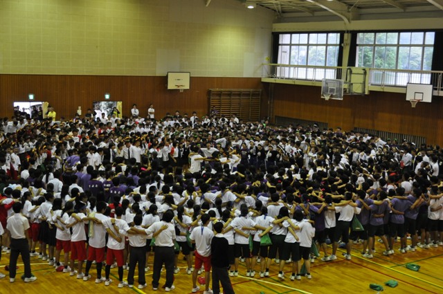 最後は全校生徒で肩を組み校歌を熱唱しました。ものすごく大きな声、心が熱くなりました!!