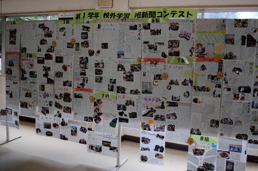 昇降口には、先月の校外学習で作成した、班ごとの新聞が掲示されています。