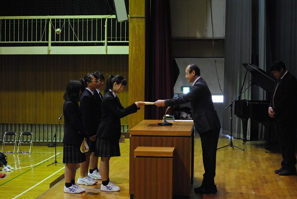 始業式の前に、吹奏楽部とテニス部の表彰がありました。どの部活も頑張っていますね!