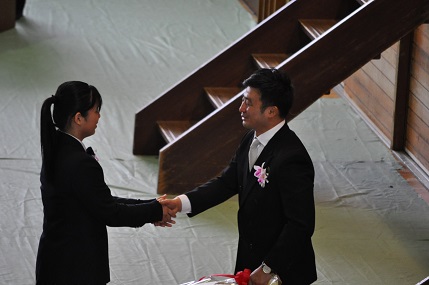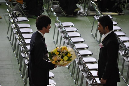 最後の卒業生退場時、卒業生が一斉に起立し、学年主任にお世話になった一言を述べ、花束を渡す場面も。感動せずにはいられませんでした。