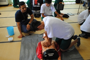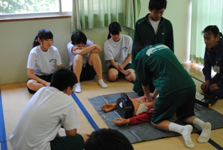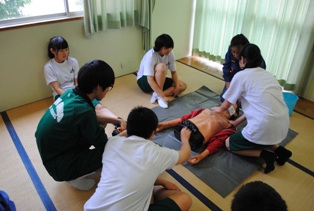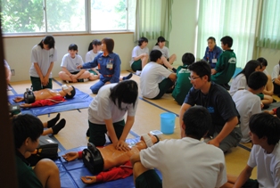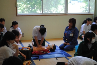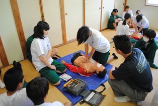生徒たちは救急救命対応,AEDの使い方を実習を通して身につけていきます。