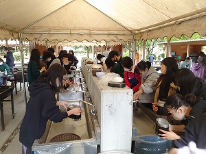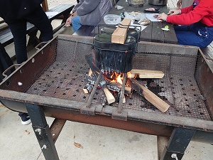 現地到着後、4~8名のグループに分かれてカレーライス作りを行いました。薪の火の具合やご飯の炊きあがり等、現地の係の方が親切に指導してくださり、みんな無事に美味しいカレーライスが食べられたようです。