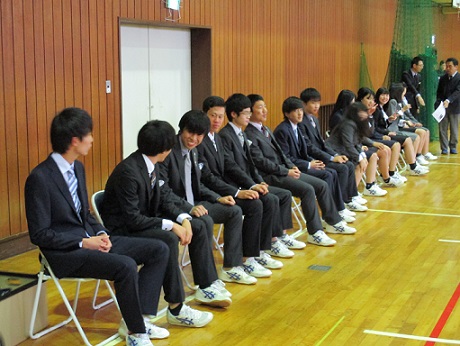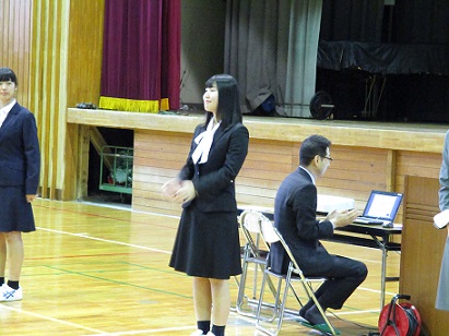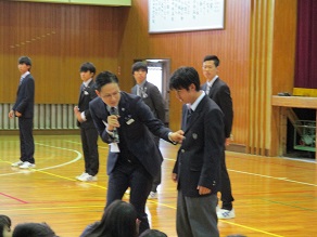 クラスで男女の代表者がそれぞれスーツを着て、着方のレクチャーを受けたようです。