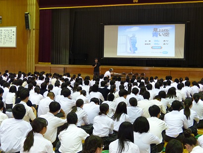 本日は、1学年集会で「見上げた青い空」というDVDを見て、いじめについて考えました。いじめについて考える生徒の眼差しは、真剣そのものでした。