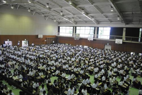 朝に降った雨でお足元が悪い中、来校してくださった中3生・保護者の皆様 ありがとうございました。今回は949名の参加でした。