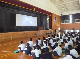 AEDの使い方や,心臓が止まった時の早めの対応の大切さなどを、VTRを見たり救急隊員の方の話を聞いたりして学びました。