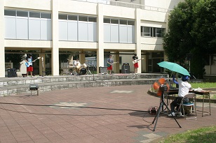 <中庭で本番さながらの練習をしています。>