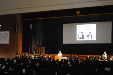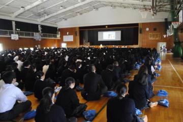 生徒会長の挨拶からスタートし、総務委員の紹介、昨年度の活動・決算報告、今年度の活動計画・専門委員会活動計画・予算案、最後に生徒会の活動の取り組みについての発表がされました。