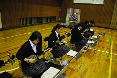 そして結団式のあとは歌の練習をしました。民泊でお世話になった方たちへ感謝の気持ちを込めて歌う予定の「島人ぬ宝」を練習しました。三線も歌に合わせて披露します。