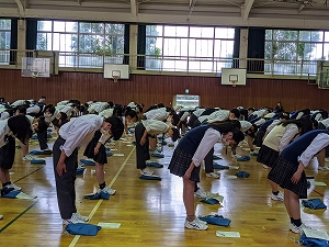 生徒は全員立ち、実際にお辞儀をしたり、ノックをする動作をしたり、学校名、氏名を口に出して言う、実践的な講演でした。体を動かして覚えることにより、生徒も理解が深まったことでしょう。