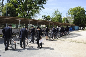 本日午後、第1学期の自転車点検が行われました。自転車置き場付近に各クラスの担任が出向き、自転車通学者に対し、ステッカーの貼付や雨合羽所持の確認、そしてブレーキや照明など安全性に関わる点検などを行いました。