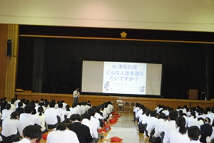 6月10日(木)の午後、1学年対象の進路ガイダンスが行われました。体育館に外部講師を招き、進学や就職に関わる様々なことを説明していただきました。本校では2学年から希望進路に応じてコースが分かれるため、1年の早い時期から卒業後の進路を意識する必要があります。