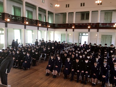 まずは、同窓会入会式です。この式では、同窓会の先輩方から卒業に向けての餞の言葉をいただきました。多くの示唆が得られるお話でしたが、その中でも特に印象に残った言葉を二つ取り上げます。