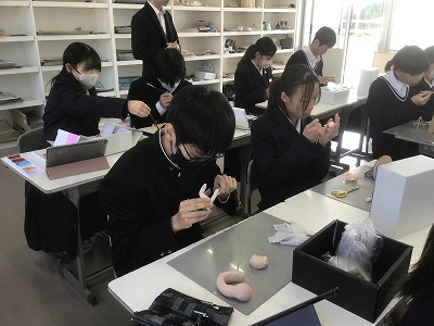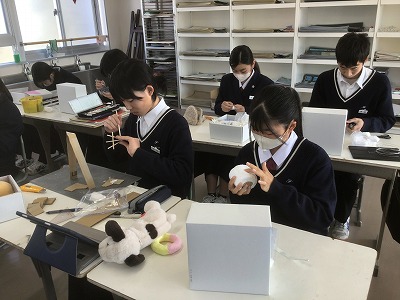 B組は美術の授業をしており、箱の中に思い思いの立体をつくっていました。形や色、そして素材を工夫して、自分の思いがより伝わる作品になるよう、対話しながら制作していました。