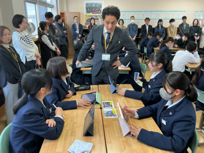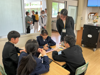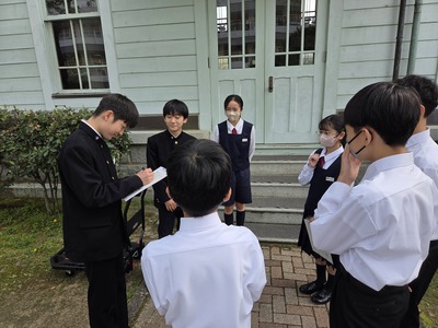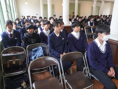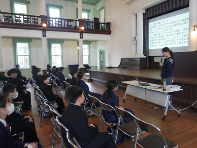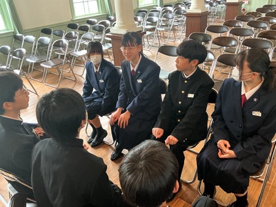 2つ目は「特色ある学校行事」です。石鎚登山研修やスキー実習、沖縄への修学旅行などの校外学習、そして附中祭や卒業記念音楽会などの校内行事を通して、自然の豊かさや仲間と協力する大切さを学び、大きな感動を味わうことができると紹介されました。 最後に「真のリーダーになるために、自ら積極的に行動し、何事にも挑戦してください。私たちも全力でサポートします」と頼もしいアドバイスが送られました。