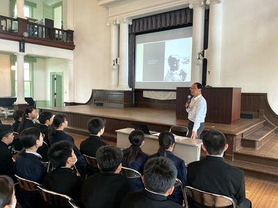 向校長先生からは、今年度創立80周年を迎える本校と、100年を超える歴史を持つ章光堂の歩みについてお話がありました。「責任ある自由」という伝統を胸に、自ら考え高める努力をしてほしいと語りかけられました。 また、桜の「ソメイヨシノ」がクローンであるという理科的な話題から、「観察の理論負荷性(持っている知識や理論によって見え方が異なること)」について触れ、本校で学問に触れながら感性を大いに磨いてほしいというメッセージが送られました。 さらに、本校が掲げる「ウェルビーイング」の精神について、「自分が立てた目標を実現していきながら、自分の良いところを認め、さらに他者の良いところも称えることができる集団を作ってほしい」と、お互いを高め合う集団づくりへの期待が語られました。