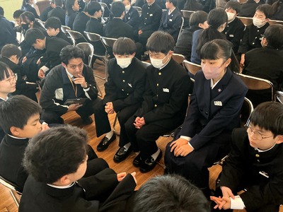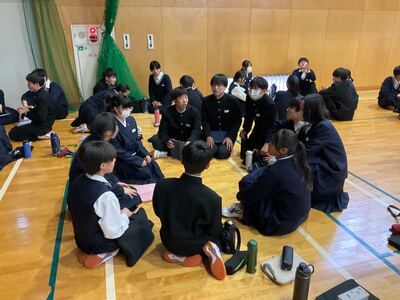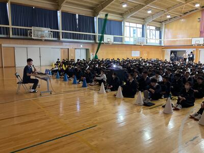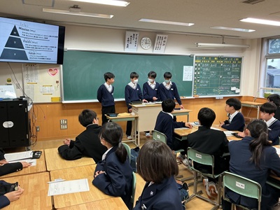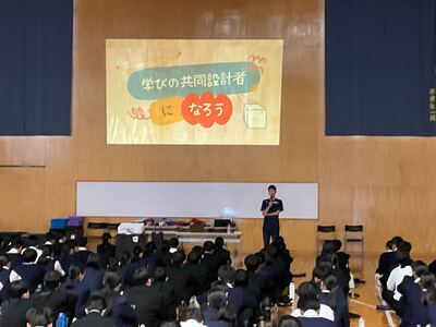 2つ目は「特色ある学校行事」です。石鎚登山研修やスキー実習、沖縄への修学旅行などの校外学習、そして附中祭や卒業記念音楽会などの校内行事を通して、自然の豊かさや仲間と協力する大切さを学び、大きな感動を味わうことができると紹介されました。 最後に「真のリーダーになるために、自ら積極的に行動し、何事にも挑戦してください。私たちも全力でサポートします」と頼もしいアドバイスが送られました。