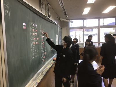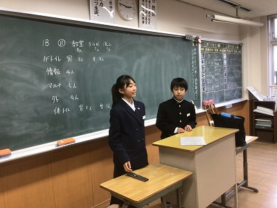 3学期の委員・係決めや清掃場所の分担を行っていました。生徒が司会・進行しながら、各学級でスムーズに話合いをすることができていました。やりたい委員会や係が重なり、話し合っている学級もありましたが、お互いに主張し合うことや、主張を踏まえて合意形成を図ることも、大切な学びです。