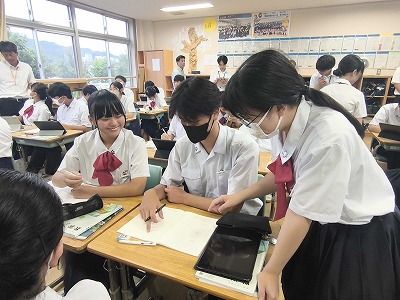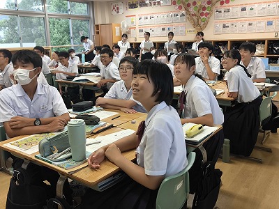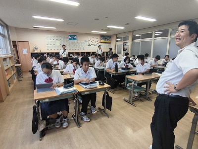本日、午後から「令和7年度 小中連絡会」を開催しました。松山市、東温市、伊予市、松前町、砥部町から計47校の先生方に来ていただきました。 まず、公開授業を行いました。生徒たちが主体的に授業に取り組み、対話と協働を通して学びを深める姿、AIやICTを活用しながら多面的・多角的に課題やその解決方法を見つめ直す姿を見ていただきました。