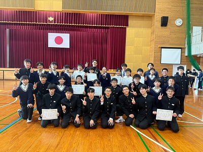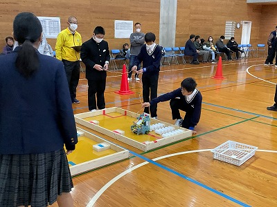 11月23日(日)、伊予市立港南中学校を会場に、「創造アイデアロボットコンテスト愛媛県大会」が開催され、本校から15チーム(基礎9、応用3、制御3)が参加しました。 基礎部門では、9チーム中7チームが予選を突破し、決勝トーナメントへ進むことができました。 制御部門、応用部門のチームは、苦戦を強いられる展開となりましたが、制御部門の1チームが決勝トーナメントに進みました。 【最終結果】 基礎部門では1年生1チーム、制御部門では、2・3年生混合の1チームが決勝トーナメントでベスト4に輝きました。この2チームは、審査員特別賞で12月7日(日)に行われる中四国大会に出場します。 また、審査員奨励賞を基礎部門で1年生・2年生1名ずつが受賞し、応用部門では2年生2名が受賞しました。