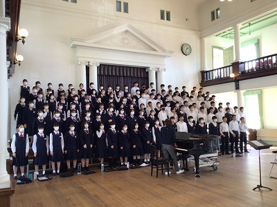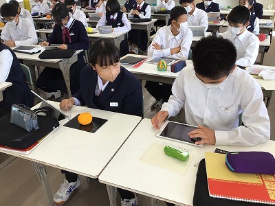 11月8日(水)5時間目の学校の様子をお伝えします。 講堂前のイチョウの木は、清々しい青空の下で黄金色に輝いており、秋の深まりを告げるかのようです。風に揺れる葉のサラサラという音が、心地よいリズムを奏でていました。 講堂に足を踏み入れると、3年生の連合音楽会に向けた学年合唱の練習を行っていました。高らかに響き渡るハーモニーが、講堂を温かい音の色で満たしていました。 美術室の前では、日光を浴びて色鮮やかな野菜たちが、まるで自然の宝石のように輝いていました。教室を覗くと、その野菜は1年生の生徒たちが手間をかけて作り上げた作品でした。 生徒一人一人の創造力が学校を彩り、学びの場が生き生きとしていることを実感します。
