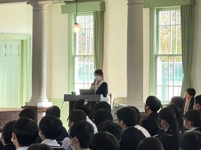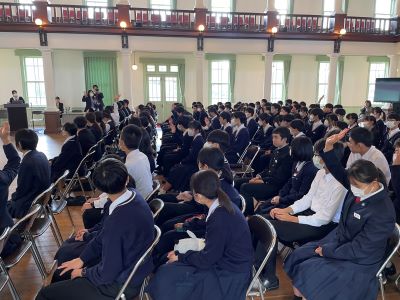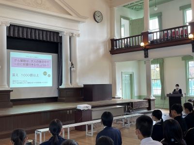 今日は「行ってこーわい!愛媛の検診」のCMでおなじみの、愛媛県総合保健協会の方々に、3年生を対象としたがん教育講演会をしていただきました。