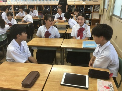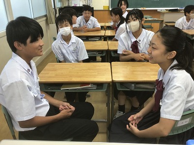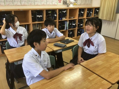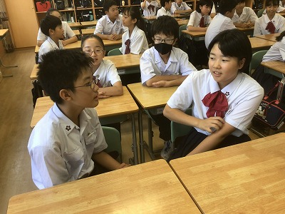 朝の時間に問答ゲームを行いました。今日は1年生のところを覗いてきました。 お題は「あなたは、晴れ・曇り・雪のうち、どれが好きですか?」でした。答える側の生徒たちは、自分が好きな天気とその理由を述べていました。また問う側は、その答えを受けてさらに質問することで、相手のより深い答えを引き出していました。 問答ゲームを通して、生徒たちは論理的に説明する力と、相手の話を考えながら聞く力を高めています。授業や日々の生活の中に生かしてほしいと思います。