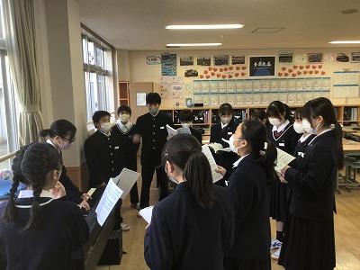 2月13日(金)6校時の授業をのぞいてきました。全クラス、卒業記念音楽会に向けた自主協働の時間でした。 1年生は、音楽の時間に学んだことを生かしながら、試行錯誤しながら練習に取り組んでいました。各パートのリーダーを中心に、音程や強弱のポイントを確認して、課題になっている部分を集中的に繰り返していました。