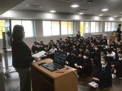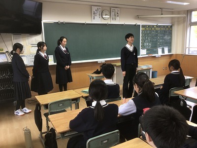 12月1日(月)、各学年の学活をのぞいてきました。 1年生は、1月に行われる「スキー実習」に向けての説明を受けていました。冬山の豊かな自然を味わえるのは、体験活動の多い附属中学校の良さです。大自然の中で仲間と一緒にスキーの技能を高めて、心も体も健やかに成長させてほしいと思います。