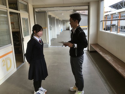 2年生は、3月の「卒業記念音楽会」に向けての実行委員決めや、教育相談を行っていました。 「卒業記念音楽会」では、1・2年生は合唱コンクールを行います。毎年どのクラスも、自分たちの力でレベルの高い合唱を仕上げ、披露してくれます。今年度も、練習期間や本番が充実したものになるものと楽しみにしています。 また、教育相談では、一人一人が安心して学校生活が送れるよう、生徒と学級担任が話をしました。中学生は多感で繊細な時期ですので、顔で笑っていても心では泣いていることがあると思います。不安や悩みは、一人で抱え込まずに気軽に相談してほしいと思います。学級担任だけでなく、教科担当や部活動顧問など、様々な立ち位置から生徒一人一人に、丁寧に関わっていきます。