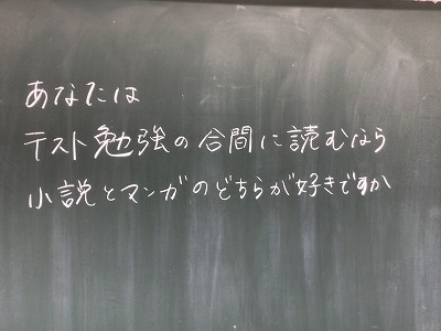 毎週木曜日は、言語技術の日です。本校では、全校で「問答ゲーム」に取り組んで、論理的に説明する力や筋道立てて聞く力を高めています。 今日は、2年生の教室を覗いていきました。お題は「あなたは、テスト勉強の合間に読むなら、小説とマンガ、どちらが好きですか?」でした。 生徒たちは「小説派」と「マンガ派」それぞれの立場から、理由付けや根拠を相手に伝わるよう説明していました。2年生になると、その話を聞きながら、素早く次の質問を考えることができていました。