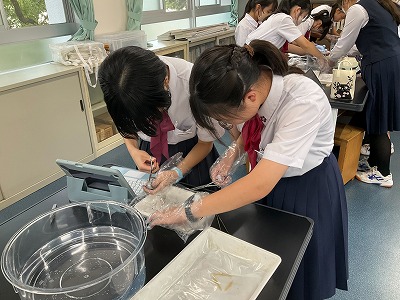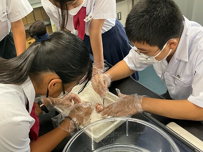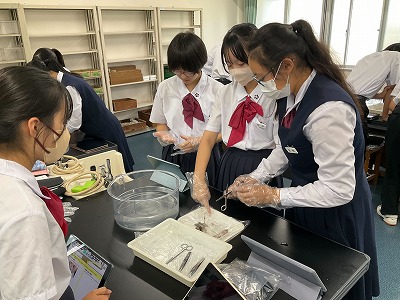 2年生の授業を紹介します。 理科の授業は、解剖実験でした。以下の選択肢から選び、班で協力して解剖を行う姿が見られました。