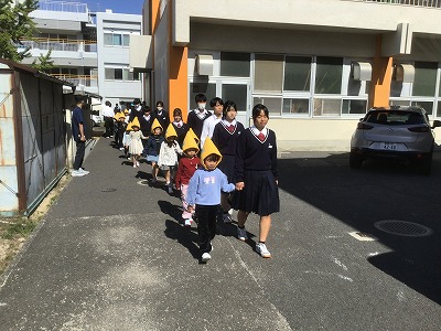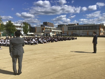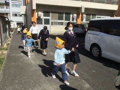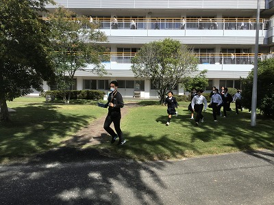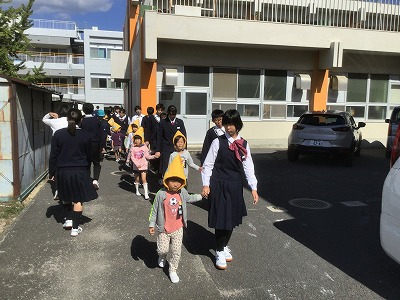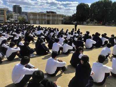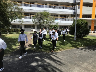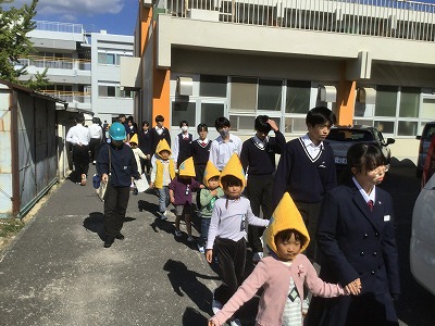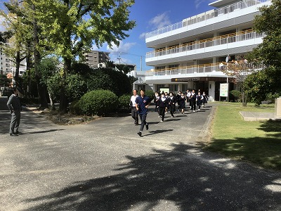 10月28日(火)、附属4校園での合同避難訓練を実施しました。 最初は、通常の避難訓練を行いました。1学期の経験を生かして、スムーズに全校生徒が動くことができ、校長先生からお褒めの言葉をいただきました。 続いて、1・3年生は二次避難の練習をしました。1年生は、石手川の堤防氾濫による1階浸水に備えて、2階より上の特別教室に避難しました。3年生は、附属幼稚園の園児を特別支援学校体育館まで避難誘導しました。 合同避難訓練を通して「自助」「共助」「公助」の大切さについて学ぶことができたと思います。