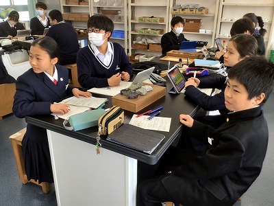 3月5日(木)、4時間目の1年生の授業をのぞいてきました。 A組は、社会の授業で「応仁の乱をきっかけとして、社会はどのように変化していったのだろうか?」について学んでいました。応仁の乱の年代や主要な人物名だけでなく、乱の背景や大名の支配の形、民衆のくらしへの影響について考察することができていました。