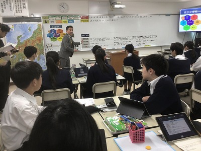 11月6日(木)、本校では二つの授業研究会を実施しました。 午前中は、「概念型探究授業研究会」と題して、2年C組の社会科の授業を公開しました。概念型探究は、事実の理解から概念的思考へと生徒を導く授業アプローチです。 本実践では、「中部地方で工業が発展している場所の特徴を探ろう」という主題について、 ①導入する ②方向を定める ③調べる ④整理する ⑤一般化する ⑥転移する という六つのフェーズを経ることで、生徒たちは調べた事実的知識をもとに概念的理解に向かうことができました。