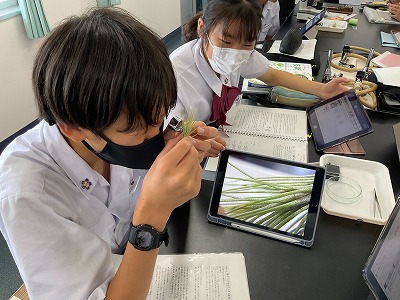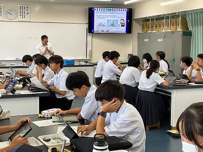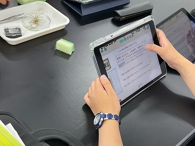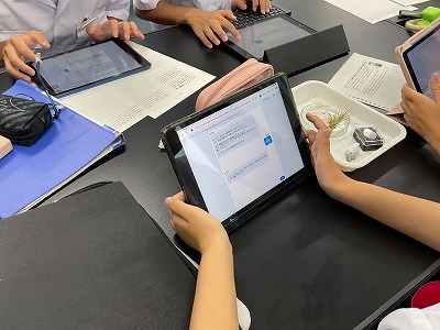 この授業では、自分が植物学者であるという設定で、根を必要としない植物「エアプランツ」について中学生に説明するというパフォーマンス課題に取り組んでいました。生徒たちは課題に取り組む過程でAIを活用し、課題や疑問を整理したり、自分の考察をチェックしたりしました。また、自分の考察についてクラスメイトや教師と対話することを通して、学びを深めることができていました。