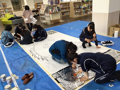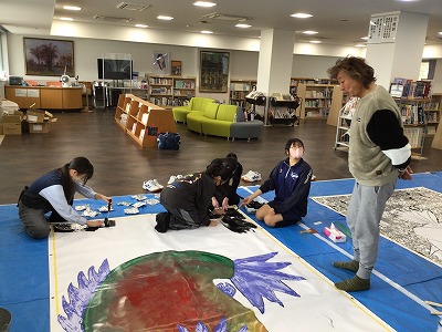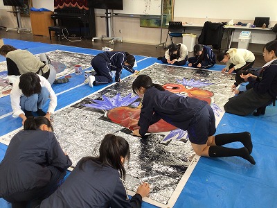 【美術部】 愛媛ゆかりの画家であるアマクーダー・ムラカミ氏との共同制作を行いました。附中生が表現したいことと、プロの芸術家の発想が一つになった素晴らしい作品が完成しました。完成品は、愛大ミュージアムに展示予定です。ぜひ足を運んで迫力ある共同作品をご覧ください。