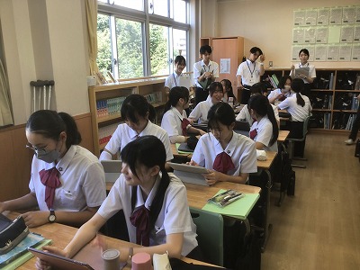 の四つの追究班に分かれ、それぞれの分野で学習課題を設定し、調べ学習を行ってきました。今日は、その成果を持ち寄り、発表資料を作成したり、発表練習をしたりしていました。