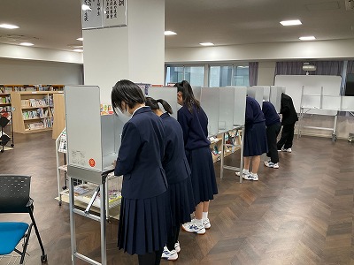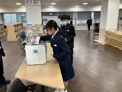 11月25日(火)、5・6校時に「生徒会役員選挙討論会・投票」が実施されました。 まず、立候補者による集団討論が行われました。 一つ目のグループは、「真のリーダーとは」がテーマでした。「自分から主体的に動くことができるのが、真のリーダーだ。」「真のリーダーには行動力が欠かせないと思う」という意見が出ましたが、次第に「みんなの思いを受け止める力も必要ではないか」という話になっていきました。 二つ目のグループは、「委員会活動を活性化させるためには」がテーマでした。振り返りから現状を把握することや、それをもとに改善していくことが大切だという意見が出ました。また、活性化させるための方策にも話が及びました。 三つ目のグループは、「学校のウェルビーイングを達成するためには、個人の自由と集団の規律をどう保つか」というテーマでした。難しい内容のため、最初は「学校ウェルビーイング」だけを捉えた話合いになってしまいましたが、軌道修正後は「集団が安定することを優先し、それから個人の自由も大切にできるようにしたい」という話になっていきました。 続いて、松山市の選挙管理委員の方から選挙啓発に関する話をしていただきました。生徒会役員選挙と大人の選挙の共通点を挙げられ、生徒会選挙の延長線上に実際の選挙があることを生徒たちは理解することができました。 最後に、フレキシブル学習室に設置された選挙会場へ移動して、投票を行いました。