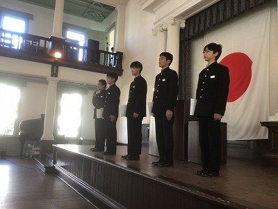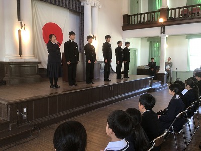 最後に、生徒会本部役員の任命式・交代式がありました。新旧生徒会本部役員の皆さんが登壇し、挨拶をしました。 旧本部役員の皆さん、1年間お疲れ様でした。生徒一人一人の声を大切にし、生徒会活動をよりよくしようと改革する姿は、大変立派だったと思います。 新本部役員の皆さん、附属中生徒会活動の良き伝統を継承しつつ、新たな挑戦をしてほしいと思います。