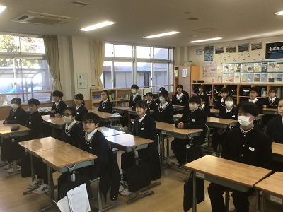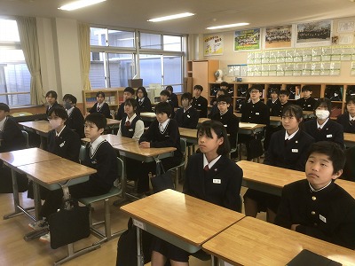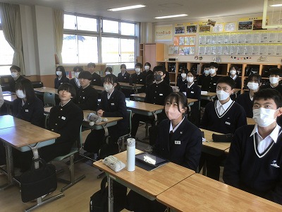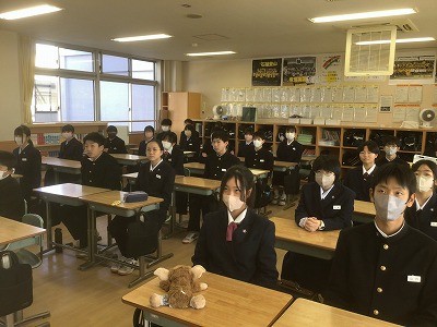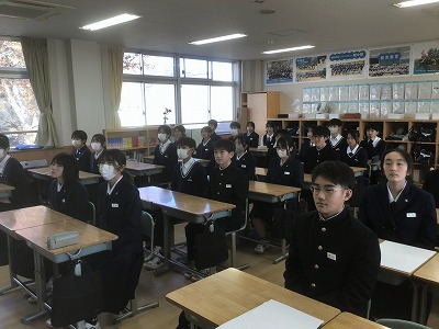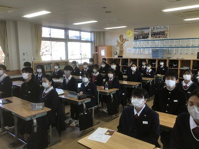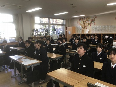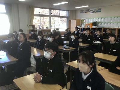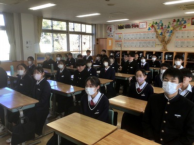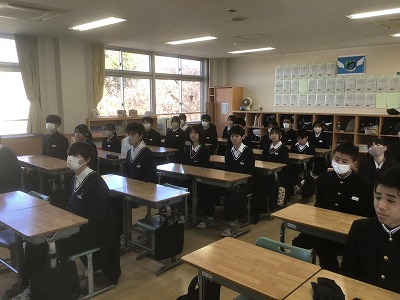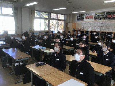 12月22日(月)の午後から、表彰伝達と2学期終業式が行われました。 先週からじわじわと感染症が広がっているため、その対策として、表彰と終業式は放送室で行い、生徒たちは各教室で見る形にしました。 校長先生からは、新年を迎えるにあたって、これまでの学習や生活をしっかりと振り返るとともに、新たな目標設定をしてほしいとのお話がありました。生徒一人一人が目標を新たに、充実した冬休みが送れることを願っています。 最後になりますが、体調を崩して本日やむを得ず欠席した皆さん、1日も早く熱が下がって回復することを願っています。お大事に。