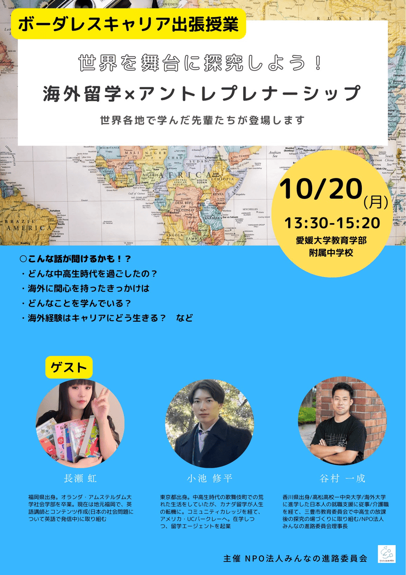 NPO法人みんなの進路委員会主催による「ボーダレスキャリア出張授業」を実施しました。「世界を舞台に探究しよう!海外留学×アントレプレナーシップ」をテーマに、海外大学での学びや起業の経験を持つ先輩方から、貴重なお話を伺いました。