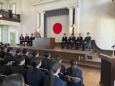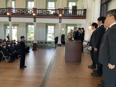 生徒代表 歓迎の言葉 先生方のご挨拶の後、生徒代表から歓迎の言葉が贈られました。 「本校は『学校ウェルビーイング』実現のために、生徒一人一人の個性を尊重し、自ら考え行動する姿勢を大切にしています。これは先生に導かれるだけではなく、私たち生徒が共に手を取り合い、誰もが安心して自分らしく幸せに過ごせる学校を自分たちの手で作り上げていこうという挑戦です。そして今、この式を行っている章光堂は私たちの誇りです。約100年の歴史を持ち、国の有形文化財にも登録されているこの講堂は、歴代の先輩たちが紡いできた協働の歴史の象徴でもあります。私たちはこの歴史ある場所で新たな一歩を踏み出せることに心から喜びを感じています。先生方にはこれからの学校生活の中で、私たち生徒の様子やこの学校の温かさを肌で感じていただければ幸いです。まだまだ未熟な私たちではありますが、先生と手を取り合い、新しい学校の姿を共に描けることを楽しみにしています。」 附属中学校の誇りと温かい思いが伝わる、素晴らしい歓迎の言葉でした。