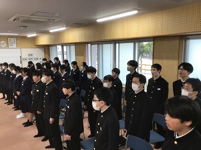 A組は音楽で、卒業記念音楽会に向けて、合唱の授業をしていました。先日のミュージカルでお世話になった愛媛大学の楠先生が、2年生各クラスにアドバイスをしてくださっています。全員での合唱を一通り聴いていただいた後、ポイントを絞って的確にご指導をしていただきました。教わったことをその場で取り入れようと試行錯誤する姿が印象的でした。