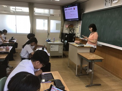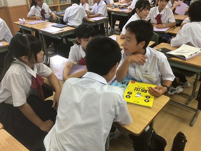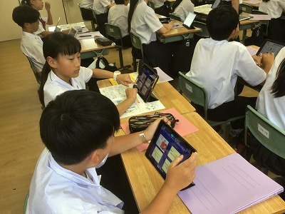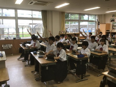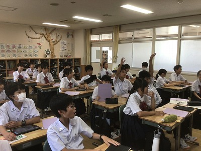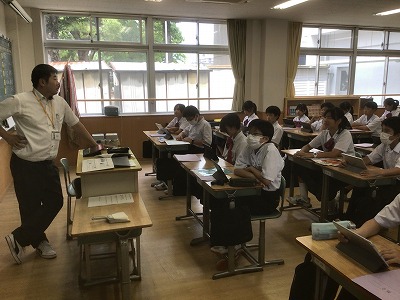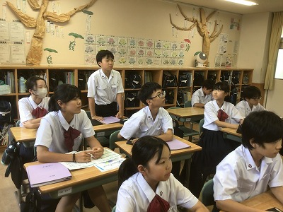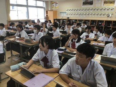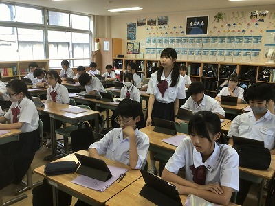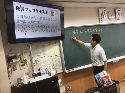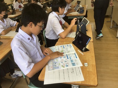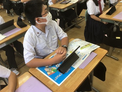 1年生は、総合的な学習の時間に防災教育を行いました。 まず、防災情報を得る手段について学びました。松山市には「松山市公式LINE」「まつやま防災メール」「防災行政無線」「ひめシェルター(アプリ)」など、複数の方法があることを確認できました。 次に、「河川氾濫」と「内水氾濫」や、「土石流」と「がけ崩れ」と「地すべり」など、違いが分かりにくい言葉の意味について学びました。 そして、ハザードマップの見方を確認した後、松山市や東温市、伊予市、松前町の防災マップを手元で見ながら、自分が住んでいる地域の状況や避難先の確認をしました。