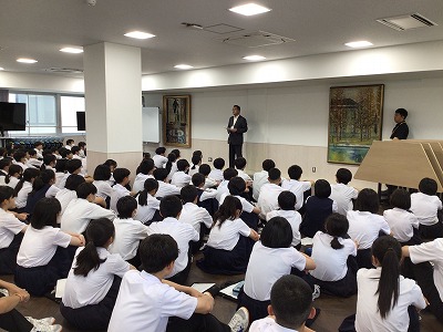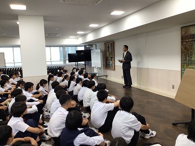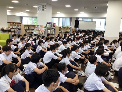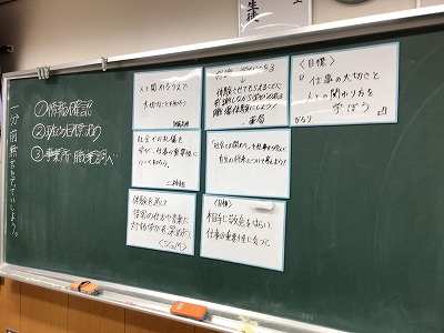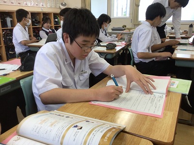 2年生は、「未来を見つめる」の続きを行いました。今回は、まず学年全体で集まり、職場体験学習の意義や流れの説明を行いました。その後、各職場に分かれ、代表者の選出やその事業所や業種についての事前学習を行いました。 職場体験学習に向けて、意欲的に取り組む生徒の姿が見られました。