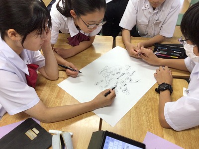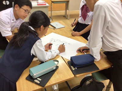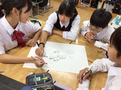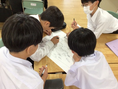 1年生は、「行く河(ライフスキル)」の続きを行いました。今回は各学級で、今の自分たちの発達段階特有の感情をつかむために「マインドマップ」を作りました。 「中学生の体と心」を中心に書き、連想するキーワードを班で協力してつなげていきました。授業の最後には、マインドマップを整理する意味で、「思春期とは〇〇である」とまとめました。 班で協働しながら学びを深めていく1年生の姿が見られました。